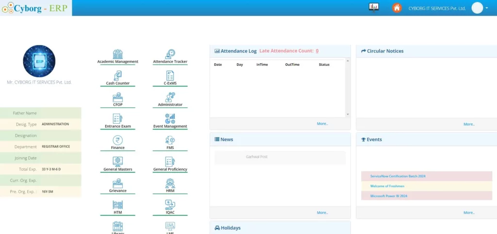 Cyborg ERP offers a comprehensive Academic Management System for educational institutions . The software is an all-in-one solution for managing academic tasks such as student registration, scheduling, attendance, grading, and reporting. It includes a user-friendly interface for students. This system is designed to enhance efficiency and streamline operations. The system also provides real-time analytics and reporting, helping administrators monitor performance and identify areas for improvement.